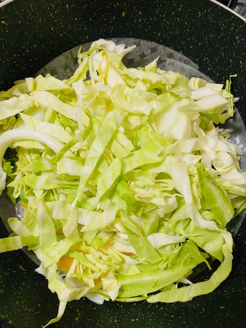 ライスペーパーに卵を乗せて崩したところにキャベツを投入!!