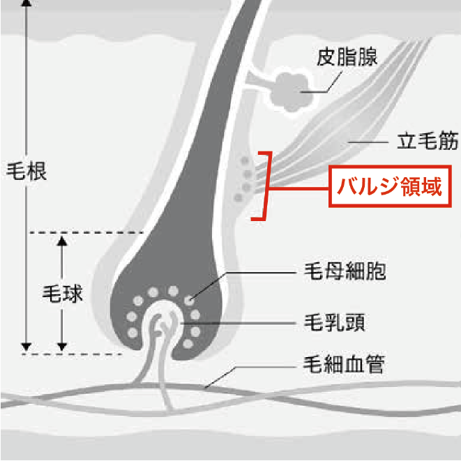バルジ領域は近年の研究によって新しく発見された細胞の一種で、発毛を促す細胞を作る働きをする重要な器官です。